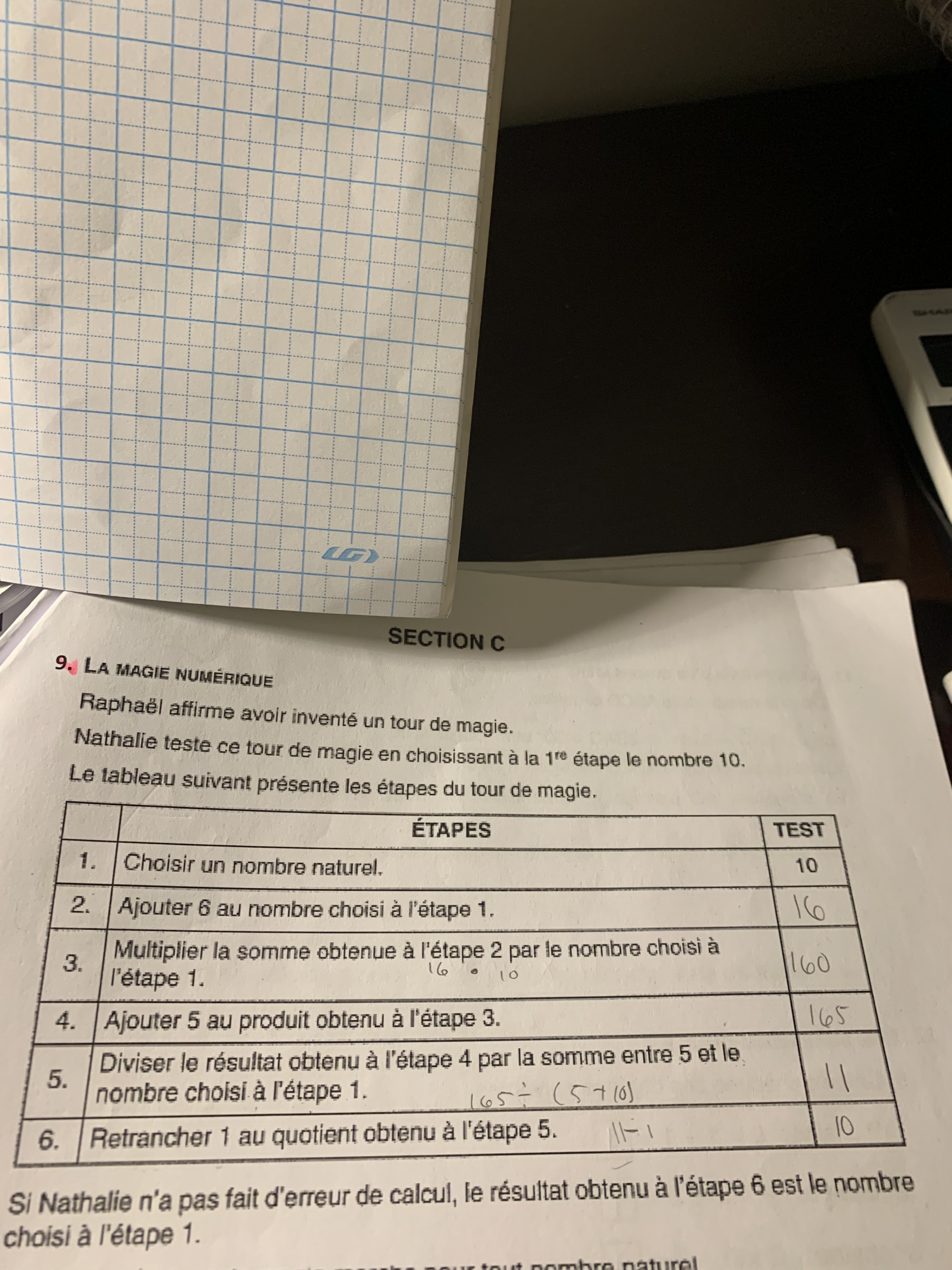 Tu dois démontrer que l'expression obtenue à l'étape 6 est égale à n.