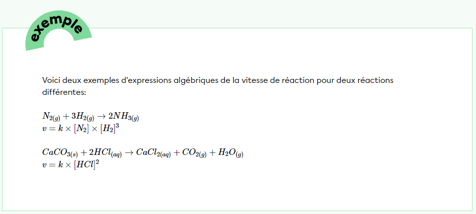 La première manière de faire est plutôt simple, tu peux écrire ta loi de vitesse en considérant uniquement les réactifs gazeux. Leur exposant (l'ordre) correspond à leur coefficient stœchiométrique. Voici deux exemples :