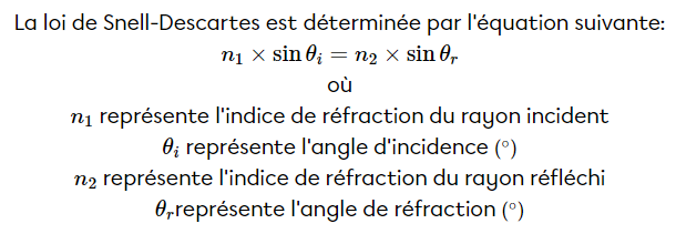 Ces paramètres sont compilés dans la loi de Snell-Descartes, qui permet de calculer l'angle de réfraction d'un rayon en connaissant son angle d'incidence et les indices de réfraction des milieux qu'il traverse.