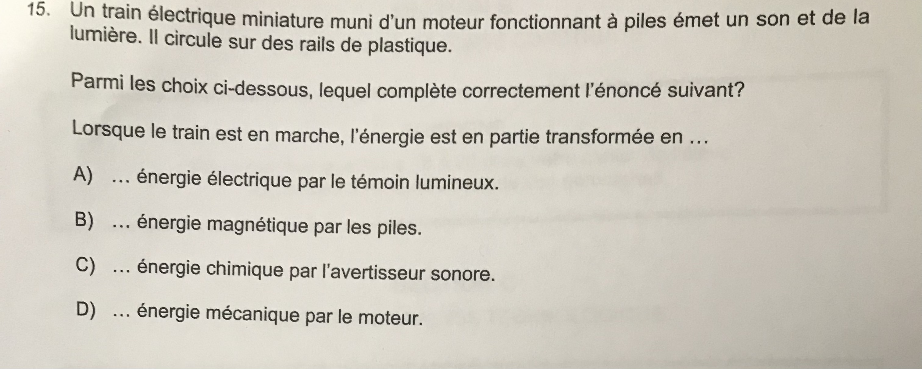 Quoique l'option A aurait été bonne, l'option D est la meilleure car le train miniature utilise l'énergie principalement pour actionner son moteur.