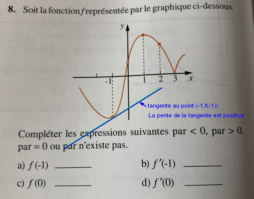 Pour f(-1), en regardant ton graphe, tu vois que la fonction est négative quand x= -1. Par contre sa dérivée, la pente de la fonction autour de x= -1 est plutôt positive (évidement quand la fonction est à son minimum elle est de zéro et avant le minimum elle était négative).