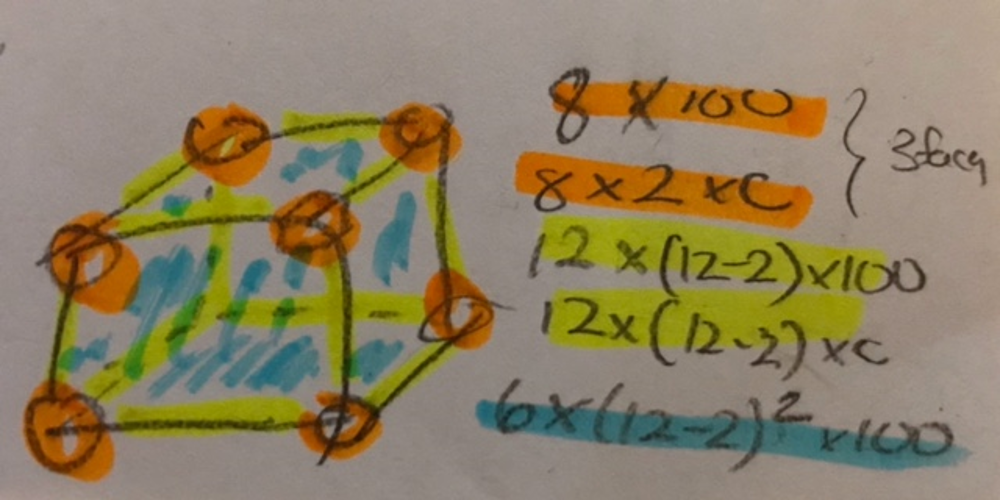 Commence par trouver le nombre de faces du cube 1x1x1 que le cube 12x12x12 possède. En fait, il y a 12x12=144 face de cube 1x1x1 sur une face du grand cube.