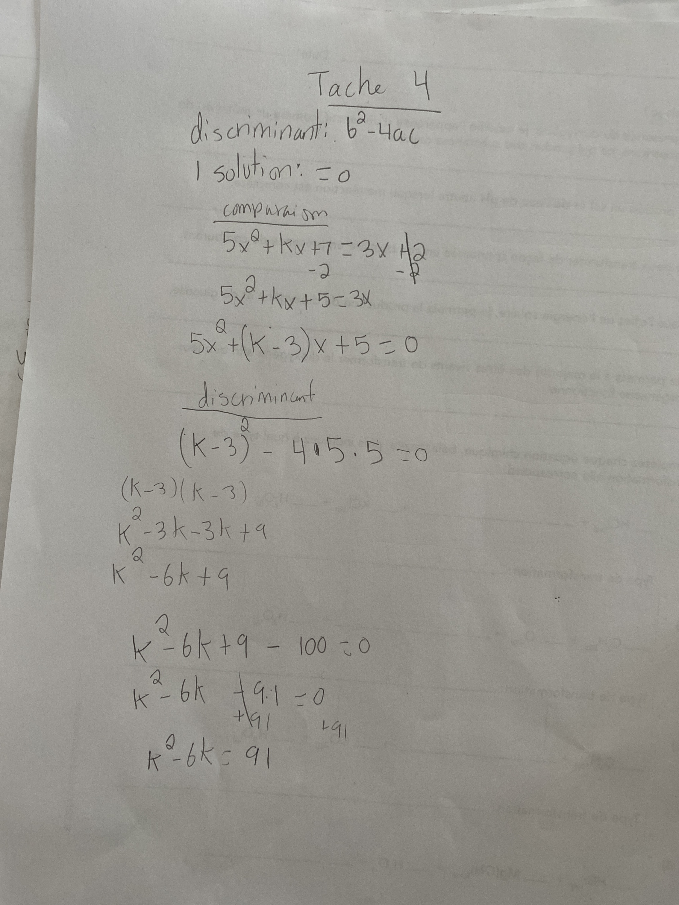 Pour ce faire, je te suggère d'utiliser la formule quadratique. En effet, il se peut qu'il y ait une ou deux valeurs de k qui permettent à l'équation du discriminant d'égaler 0.