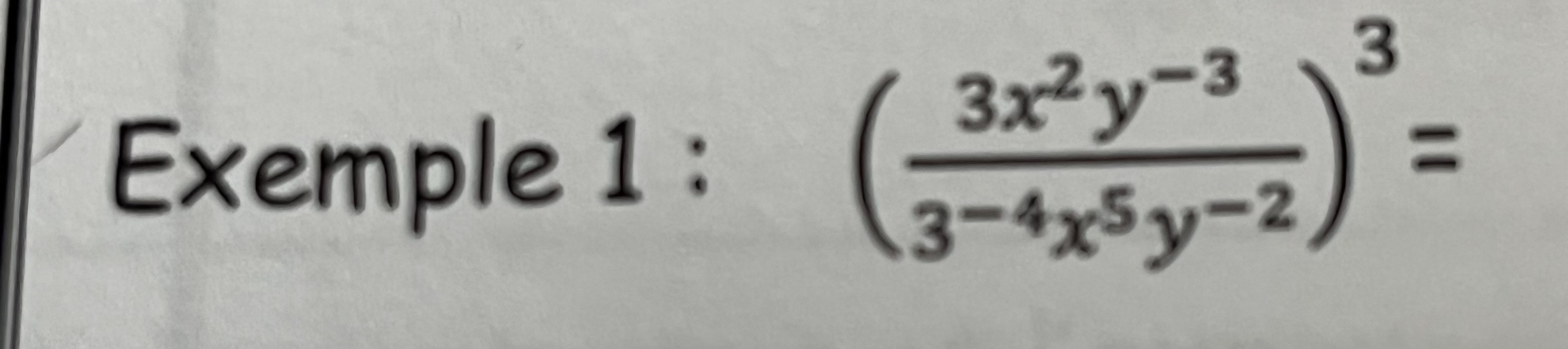$$ (\frac{3\times3^4x^2y^{-3}}{x^5y^{-2}})^3 $$