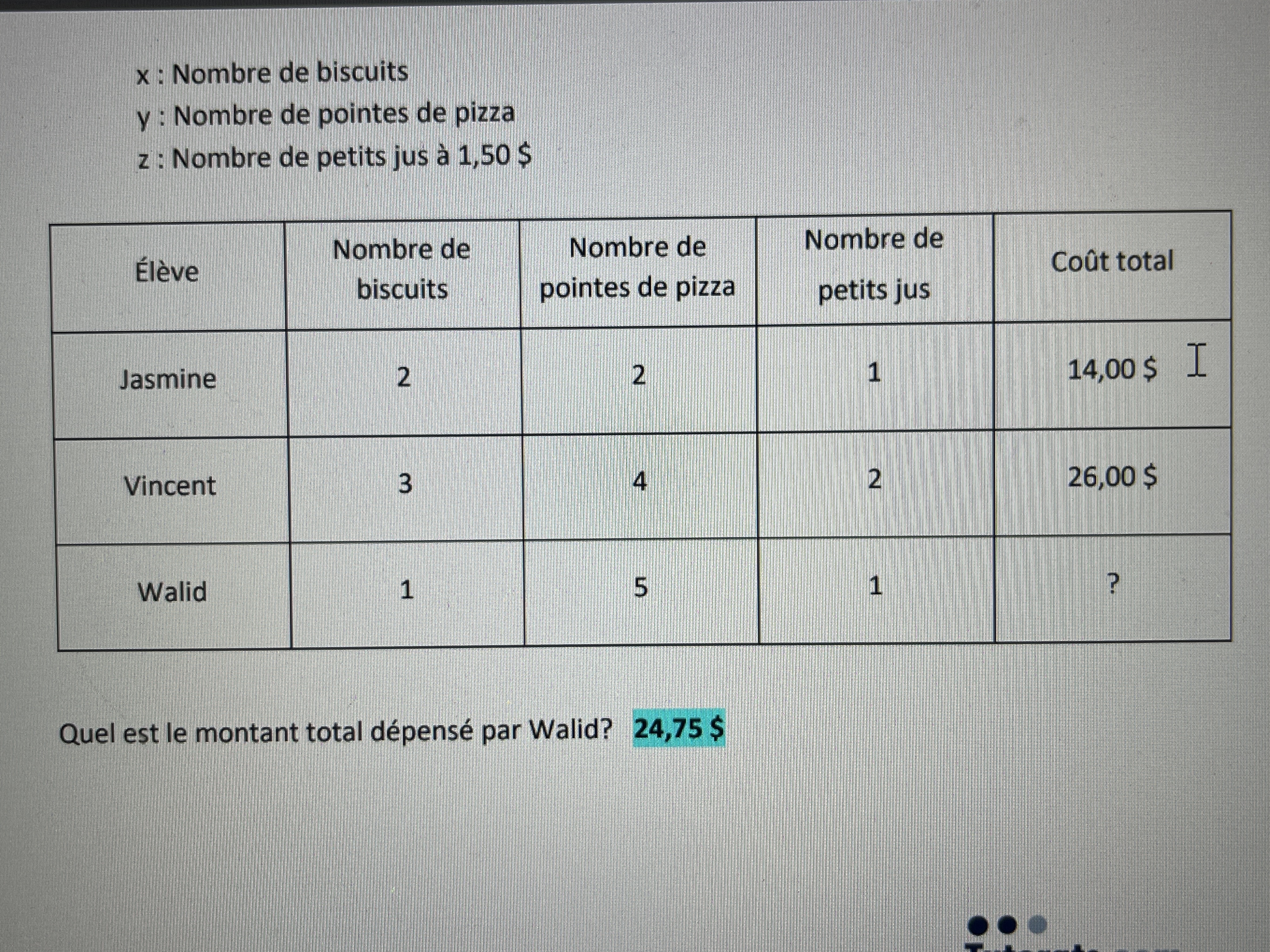 Maintenant, on sait que le montant d'un jus z est de 1,5 :