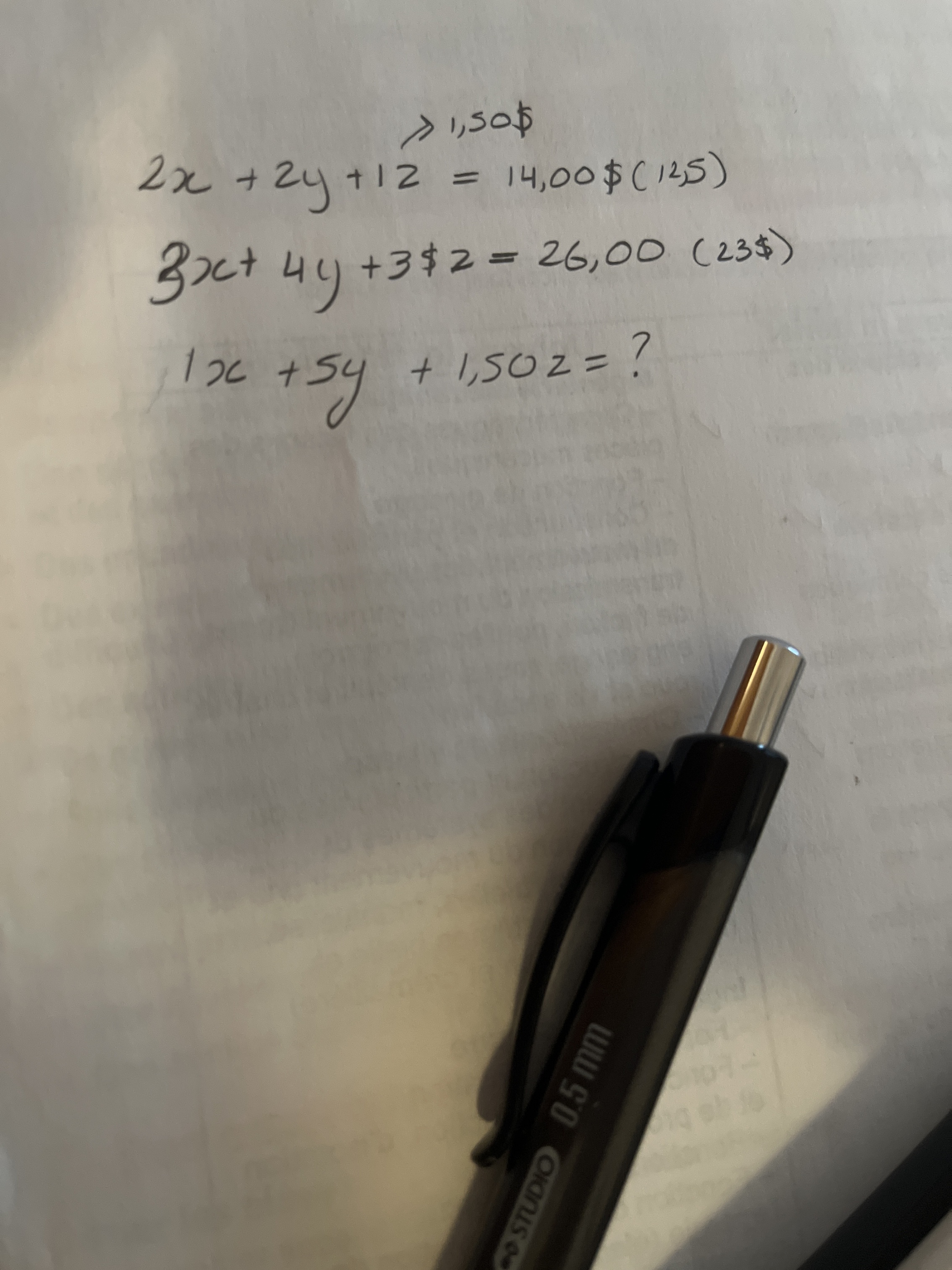 C'est un bon départ, mais je crois que la deuxième affirmation n'est pas bonne; en effet l'équation devrait être 3x+4y+2•1,50 = 26,00$