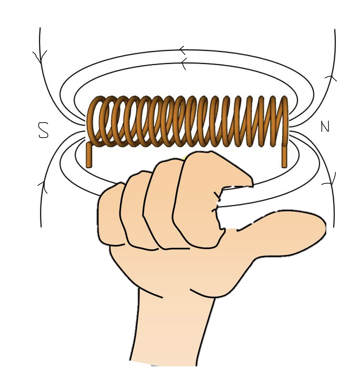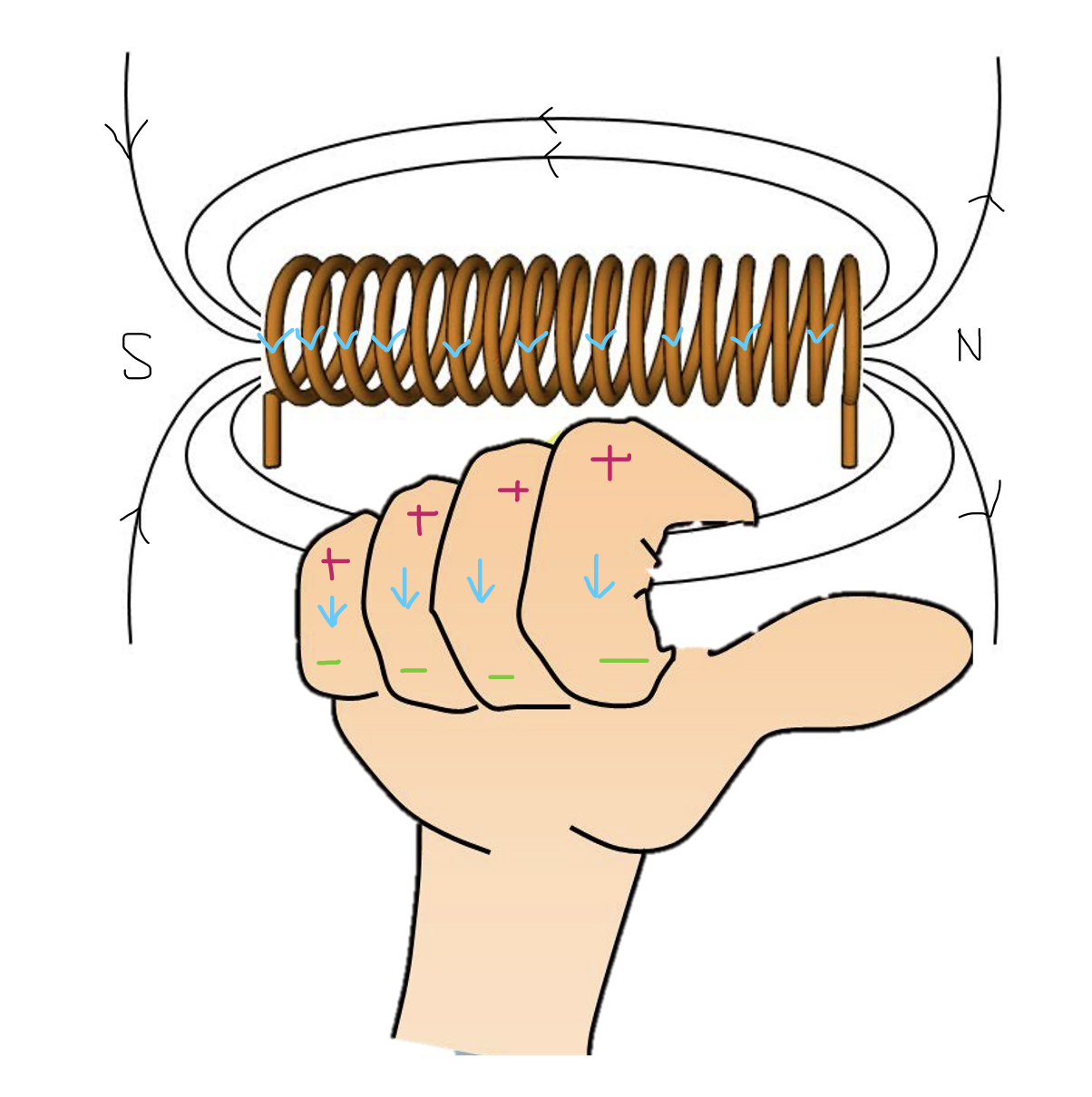 Ici, le pouce pointe toujours vers le nord d'un solénoïde. Toutefois, ce n'est pas le courant du solénoïde qui va du sud au nord, mais plutôt son champ magnétique. La position du «+» et du «-» est relative au courant électrique et non au champ magnétique.