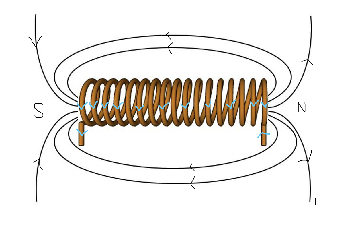 Ainsi, le «-» est situé où le courant (en bleu) sort du solénoïde, et non où le champ magnétique sort du solénoïde.