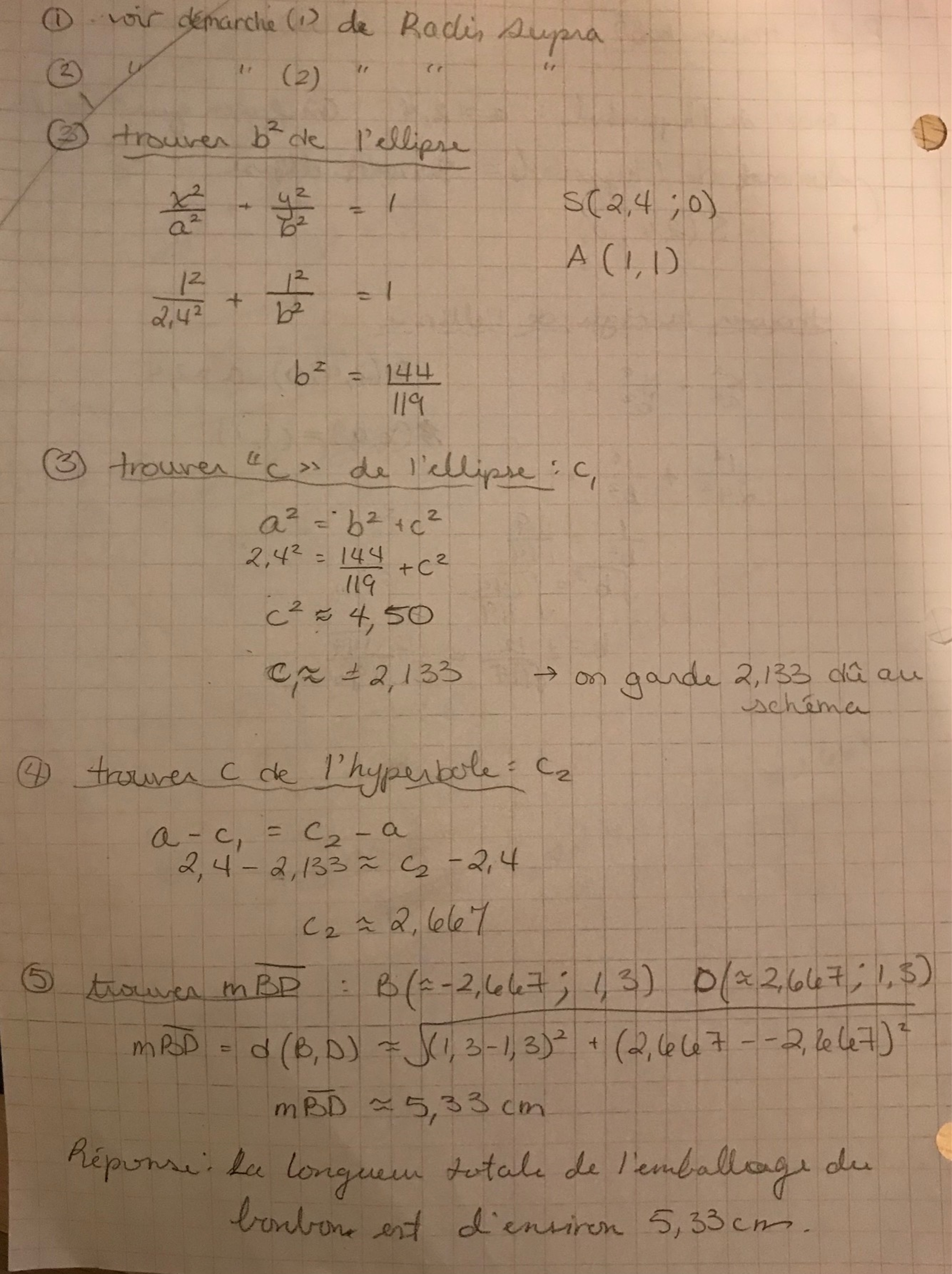 Le point A n'est pas placé sur l'axe vertical de l'ellipse, donc, le y du point A n'est pas b. Puis, avec l'ellipse, on utilise Pythagore. Ne te mélange pas non plus avec le foyer, "h" et l'équation de la directrice de la parabole.