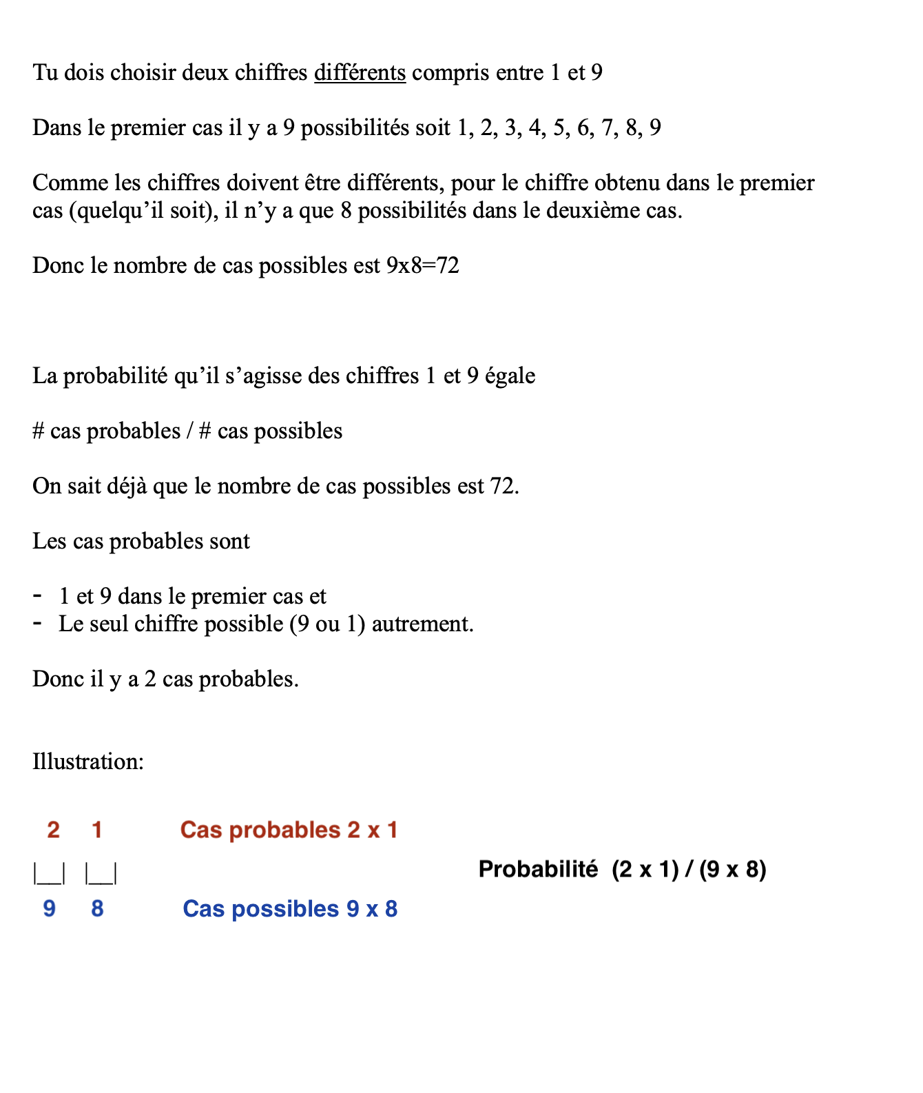 Voici l'énoncé : On choisit au hasard deux chiffres différents compris entre un et neuf inclusivement. Déterminez la probabilité qu'il s'agisse des chiffres un et neuf.