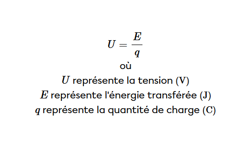 La tension, ou différence de potentiel ou voltage, correspond à la quantité d'énergie transférée entre deux points d'un circuit électrique.