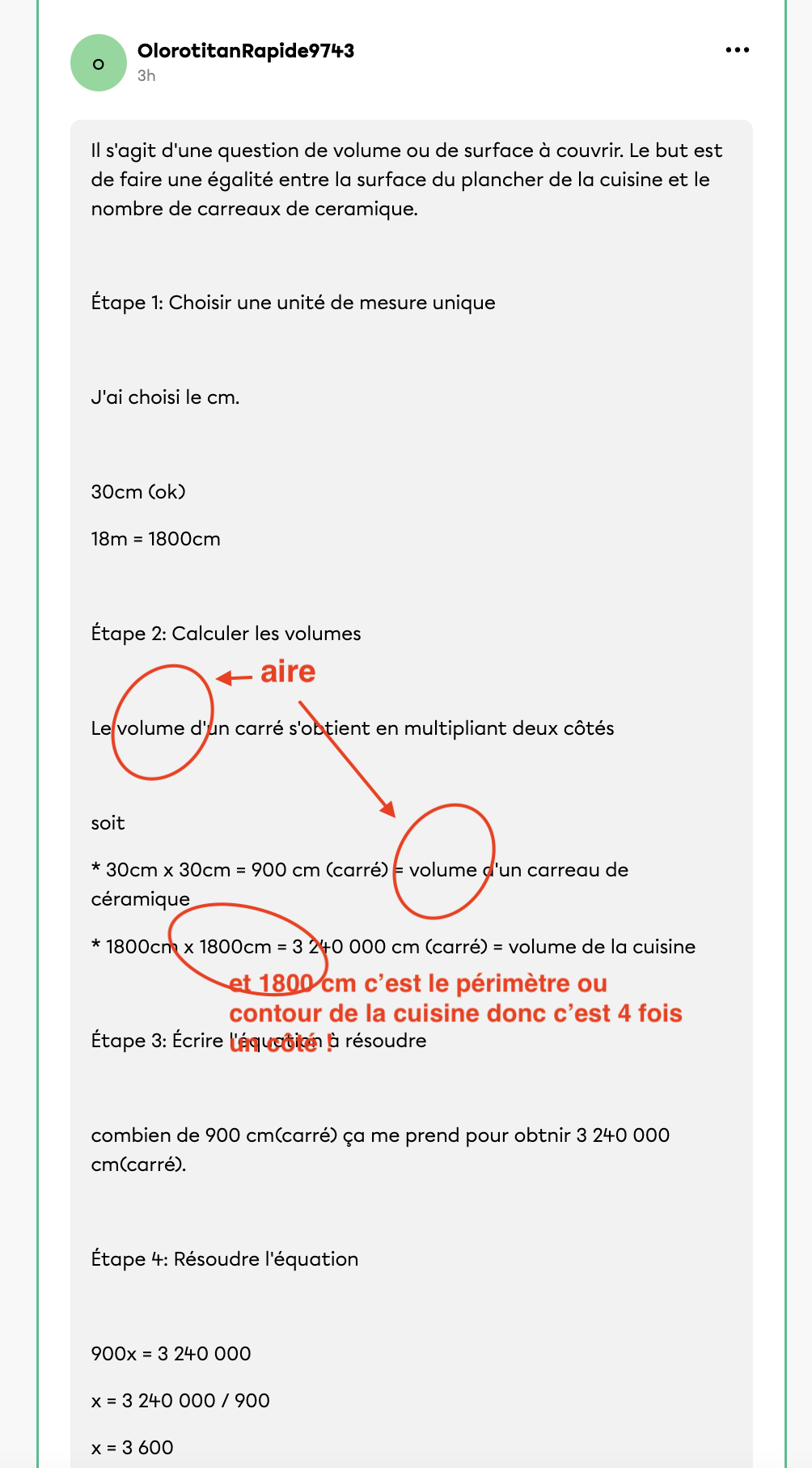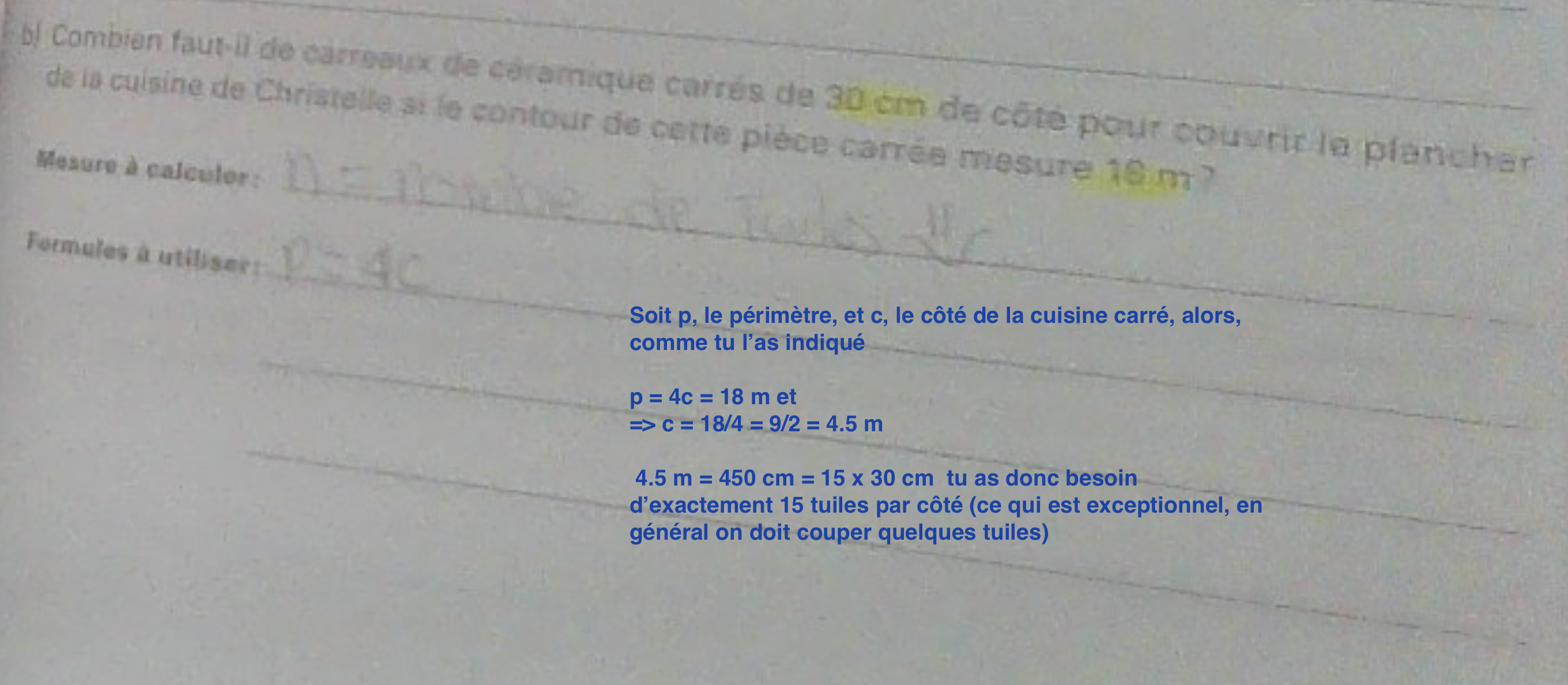 N'oublie pas de calculer le total en tuiles (l'aire de la cuisine en nombre de tuiles) sachant que tu en as besoin de 15 par côté.