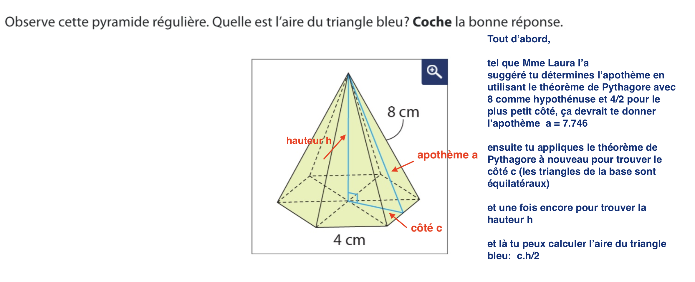 Après avoir trouvé l apothème de la pyramide qui est l hypoténuse du triangle bleu, il faut remarquer que la petite cathète du triangle bleu est la hauteur d un triangle équilatéral.