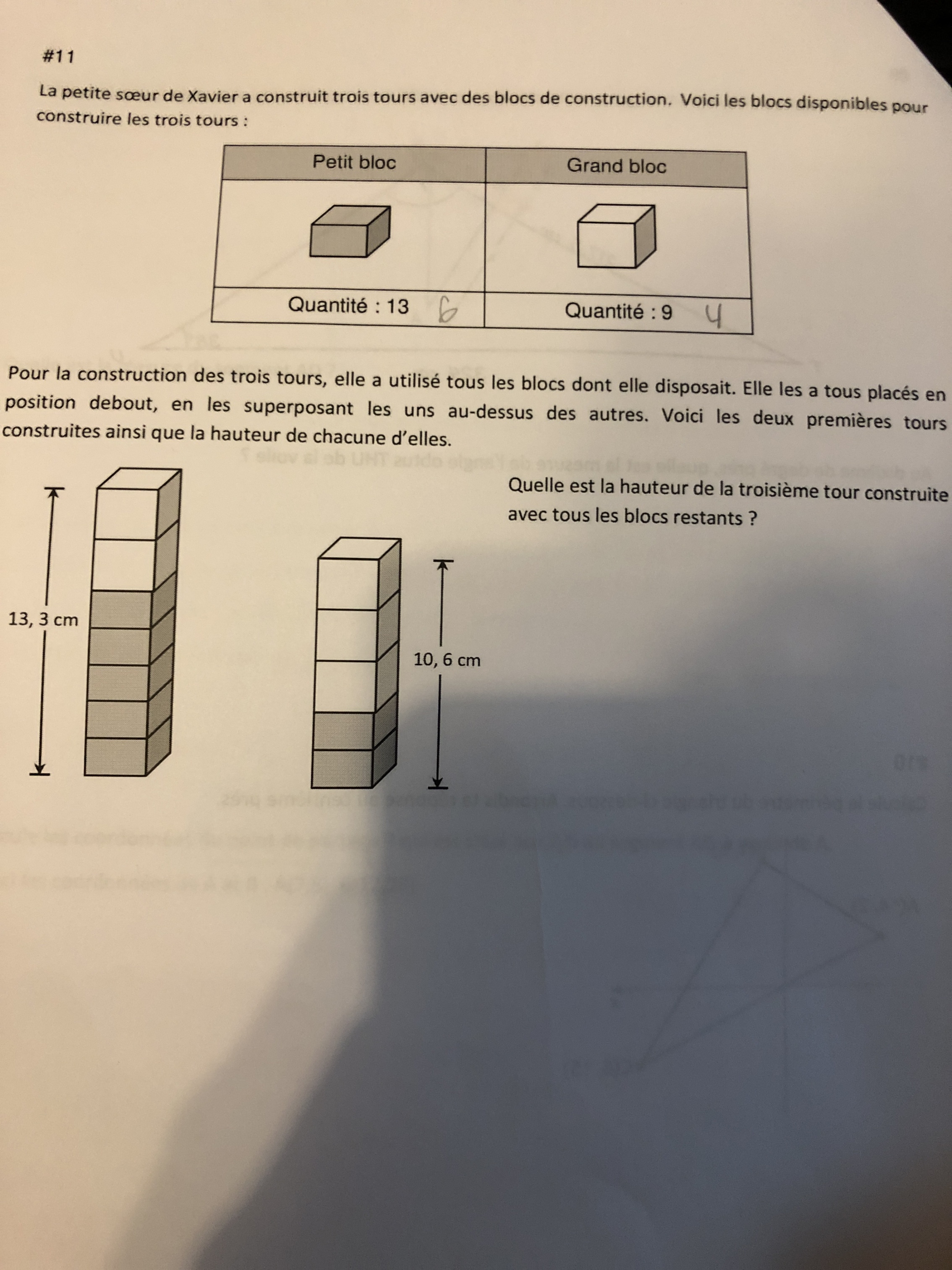 Pour connaitre la hauteur de la 3 ème tour, tu dois trouver la hauteur du grand et du petit bloc.