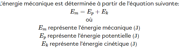 L’énergie mécanique (énergie totale) d'un objet est la somme de son énergie cinétique et potentielle. Selon la loi de la conservation de l'énergie, l'énergie mécanique est la même, peu importe la position de l'objet.