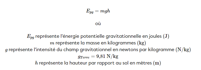 Lorsqu'un objet est situé à une certaine distance du sol, il possède une énergie potentielle gravitationnelle. Pour calculer cette énergie, on utilise la formule suivante :