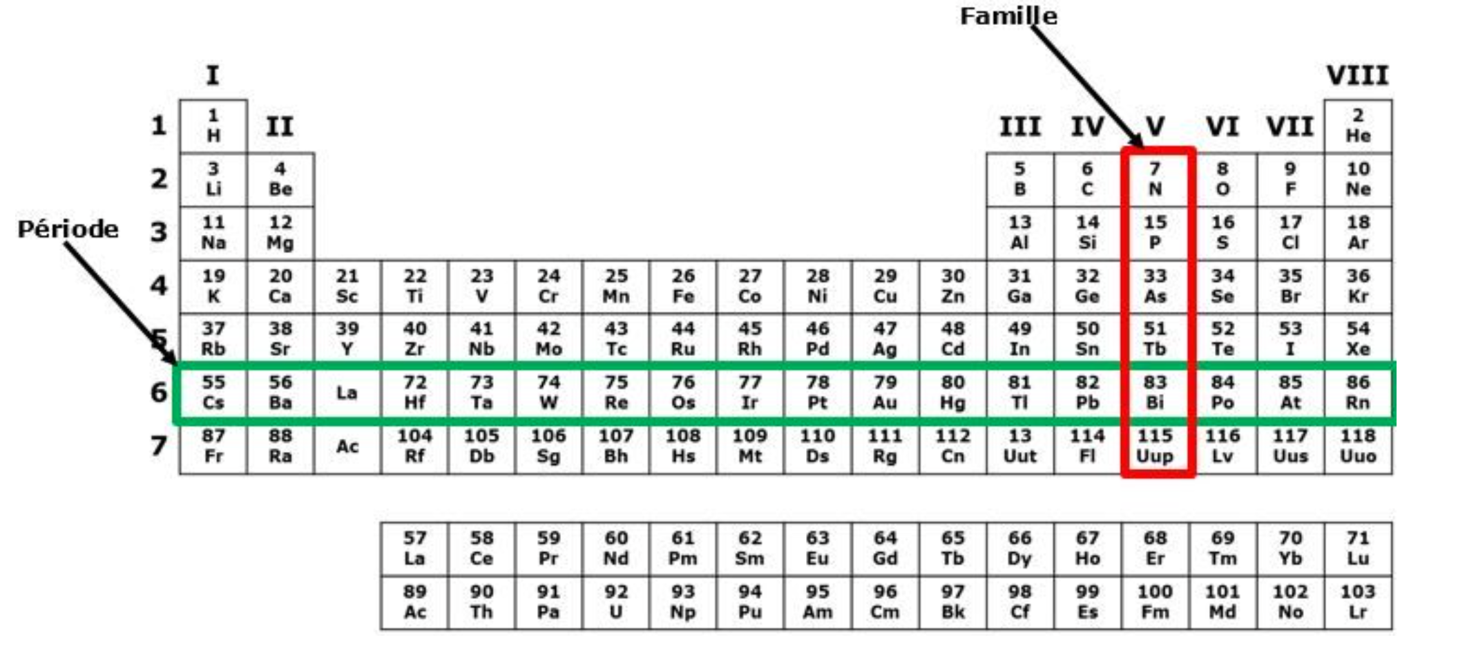 Au-dessus de chacune des colonnes du tableau périodique se trouvent des chiffres romains. Ces derniers indiquent le nombre d’électrons de valence, c’est-à-dire les électrons que l’atome possède sur sa dernière couche électronique (par exemple : Le bore (B), qui fait partie de la famille III (3), a trois électrons de valence.