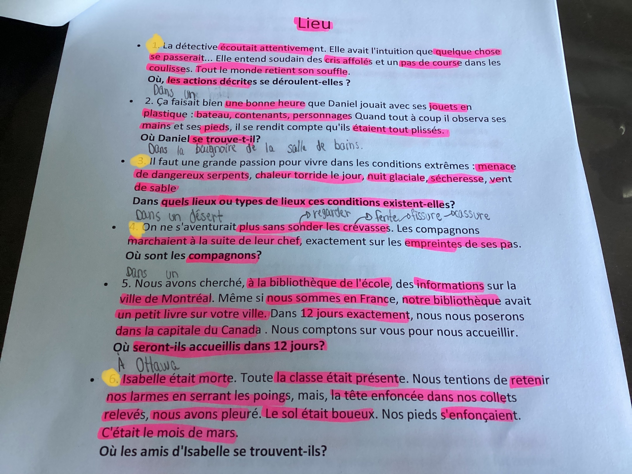 Allô, je fais une pratique d’inférences. Je ne comprends pas ces questions surlignées en jaune (1,3,4,6) . Au numéro 3 je n’ai trouvé qu’un seul lieu. Merci.