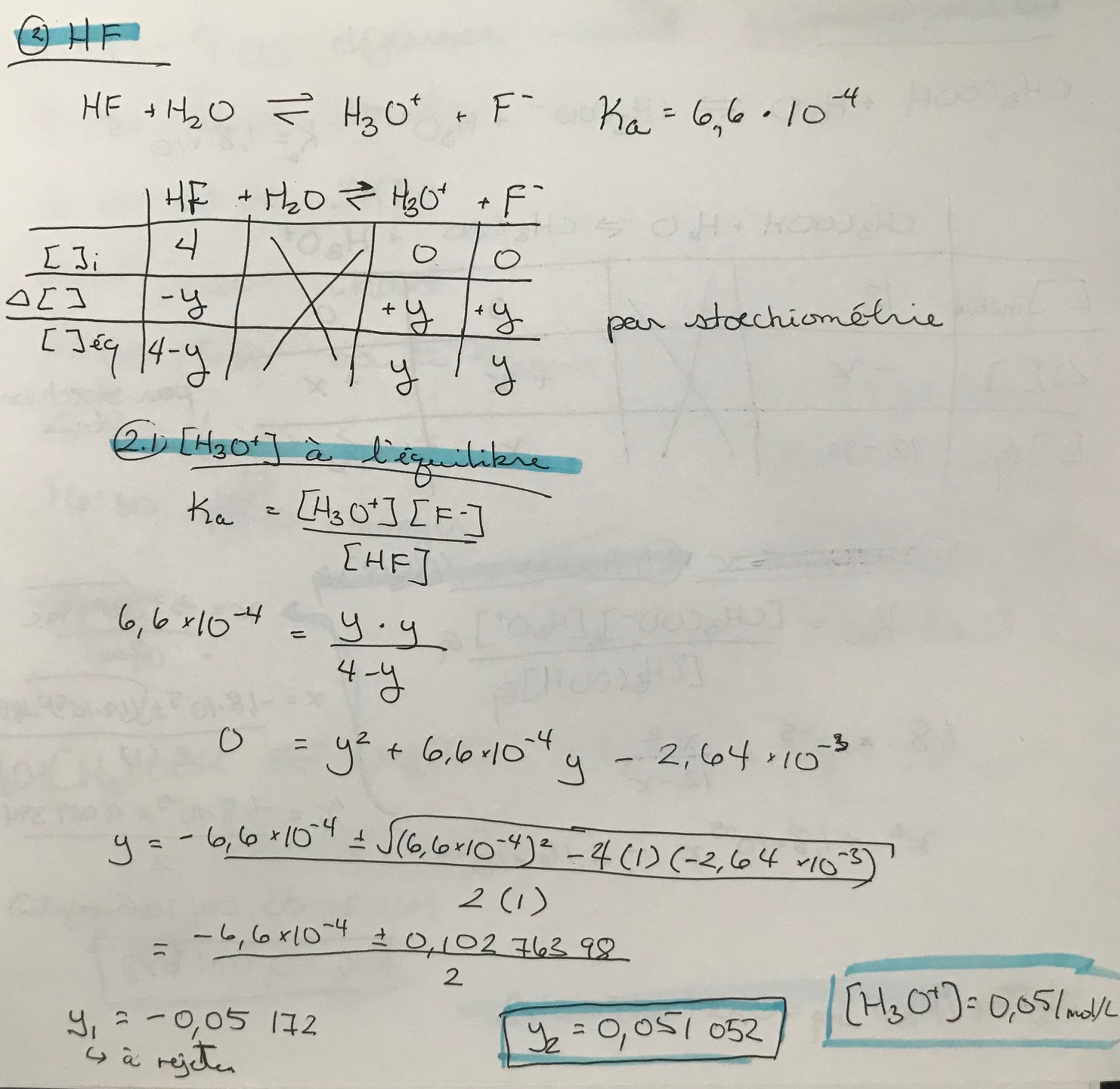 La [H3O+] du HF est supérieur à la [H3O+] du CH3COO-. Donc, le HF représente le plus grand danger d'acidification du ruisseau.