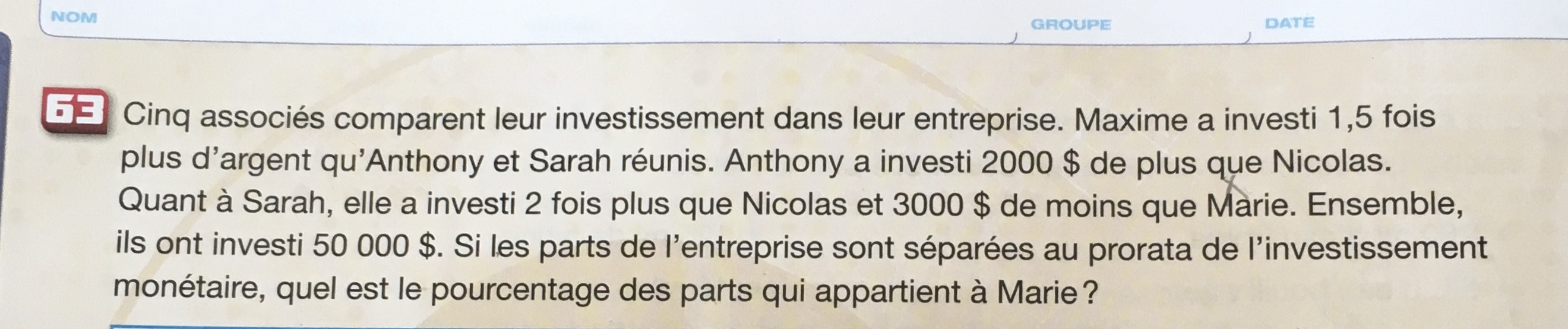Maxime (M), Antony (A), Sarah (S), Nicolas (N) et Marie (W) investissent chacun un montant dans leur entreprise; le total des montants est de 50000 $
