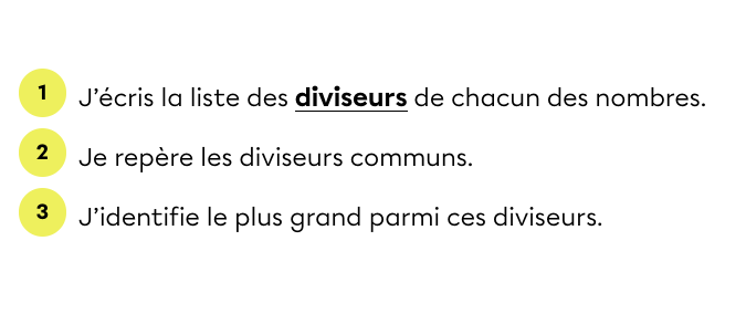3- Tu trouves le plus grand commun diviseurs que partage tes nombres !