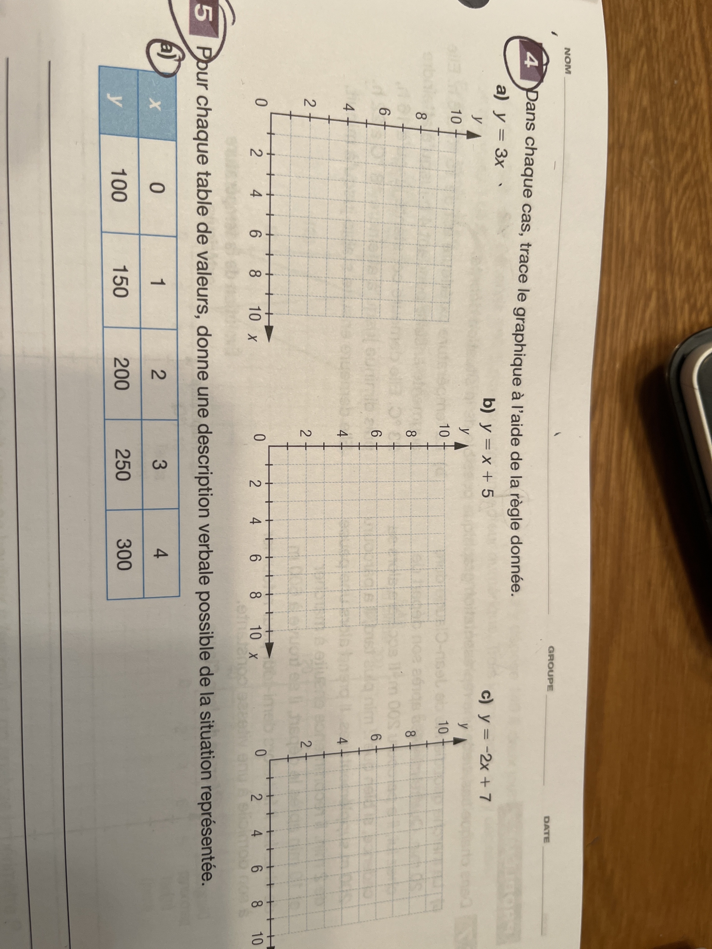 Pour le numéro 4, tu peux consulter la fiche suivante : https://www.alloprof.qc.ca/fr/eleves/bv/mathematiques/tracer-une-fonction-affine-m1122#