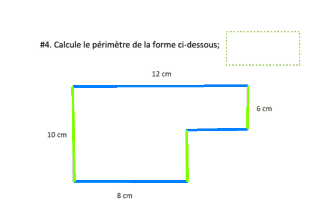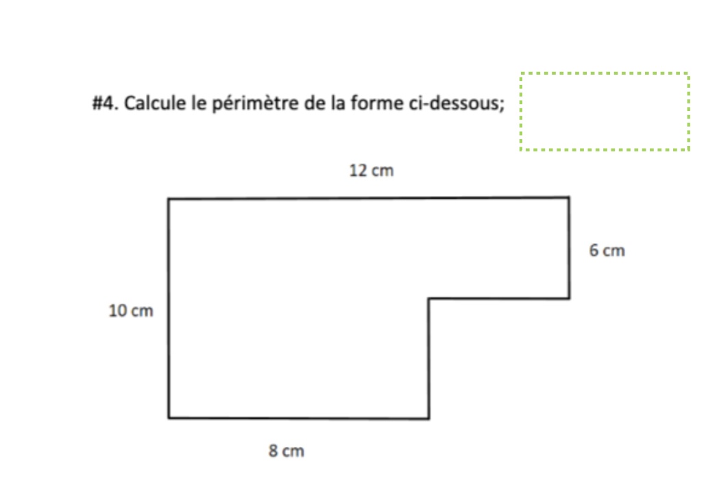 On calcule le périmètre en additionnant les longueurs du contour. Il te manque cependant deux mesures. Il va falloir que tu regardes la longeur totale (12 cm) et la largeur totale (10 cm) pour ensuite soustraire la mesure qu'on te donne qui correspond soit à la longeur ou la largeur. Par exemple, pour la mesure manquante du coté de la longeur, on a la longeur totale de 12 cm et l'autre mesure sur ce coté de 8 cm. Alors, la mesure manquante sera de 12 - 8 cm.