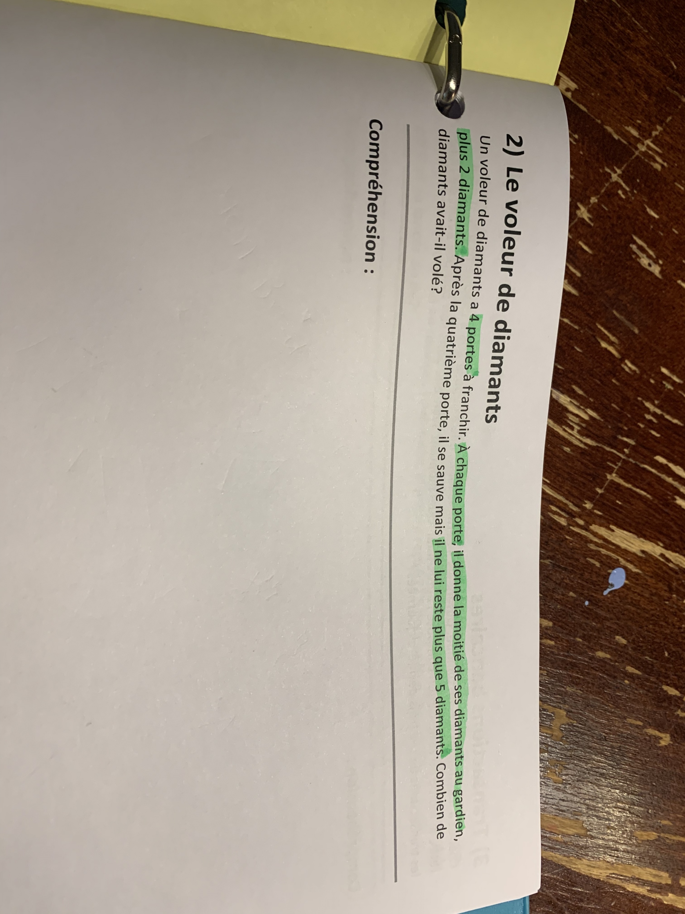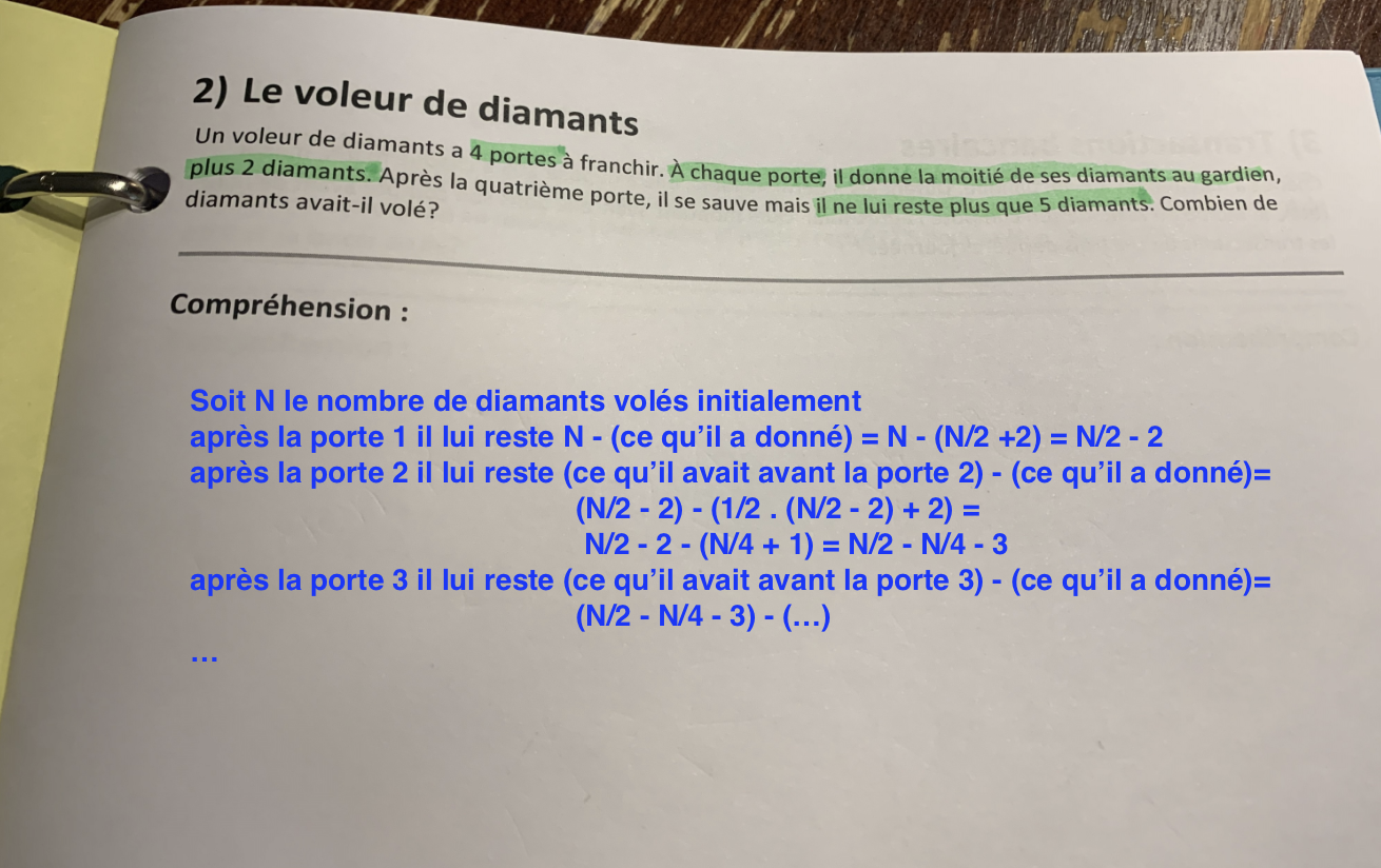 Un voleur doit franchir 4 portes et il doit donner la moitié de ses diamants ainsi que 2 diamants supplémentaires. Il fait cela 4 fois (4 portes) et il lui reste à la fin 5 diamants. On cherche à savoir combien de diamants il avait au début.
