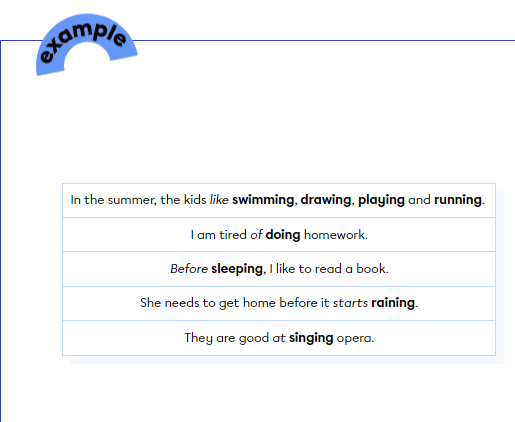 ex : The kids like to swim, to draw, to play and to run = swimming, drawing etc