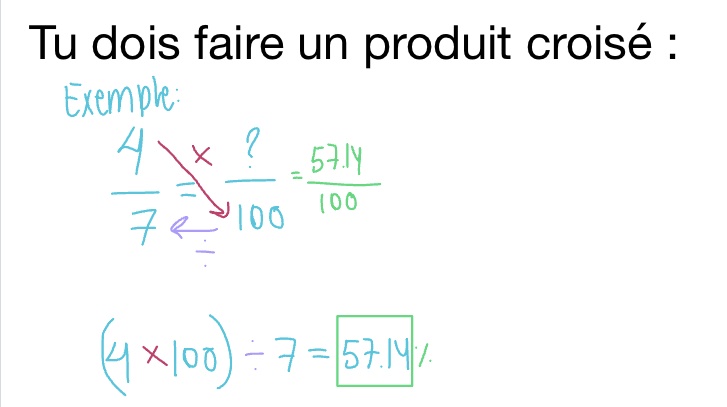 Tu n'as pas besoin de mettre le fraction sur cent pour trouver le pourcentage. Tu peux le faire, mais ce n'est pas nécessaire.