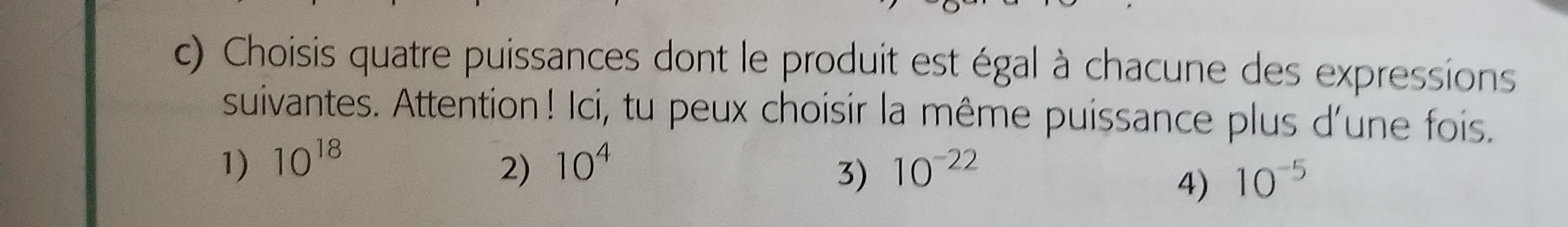 Pour chaque numéro, on te dit de choisir des puissances dont, multipliées ensemble, donne l'expression que tu voies. Par exemple, 10^3 = 1000. 100 x 10 = 1000, et 10^2 = 100 et 10^1. Alors, ta réponse est 10^2 x 10^1 = 10^3 .