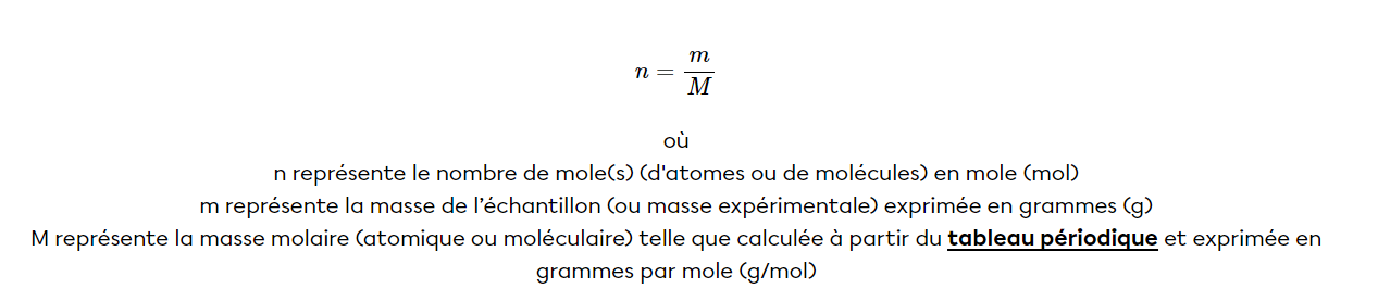 À l'aide des masses molaires, tu peux trouver la masse ou le nombre de mol demandé à l'aide de cette formule :