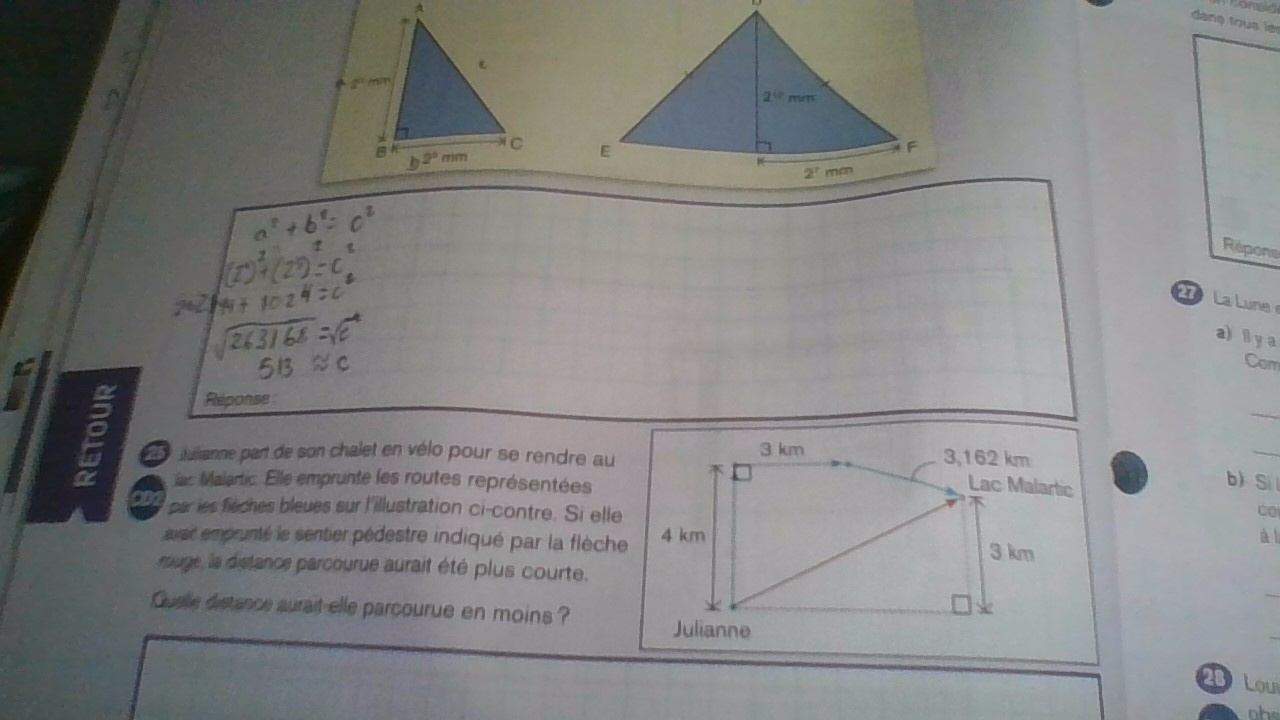 Salut! Merci pour ta question. Pour le numéro 24, tu n'a pas besoin d'utiliser le théorème du Pythagore, puisqu'il n'est pas nécessaire de trouver l'hypoténuse. En fait, tu as seulement besoin de savoir comment calculer l'aire d'un triangle :