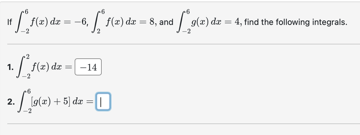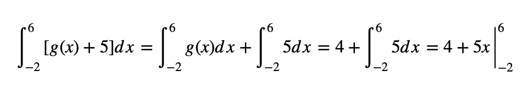 = integral de -2 à 6 de g(x) dx + integral de -2 à 6 de 5 dx