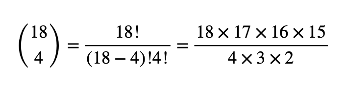 C'est comme si tu avais 4 boîtes à remplir (postes à combler) la première fois tu as 18 candidats, la deuxième tu en as 17, la troisième 16 et la quatrième 15. On divise par 4X3X2 pour supprimer les permutations (de ces 4 items)