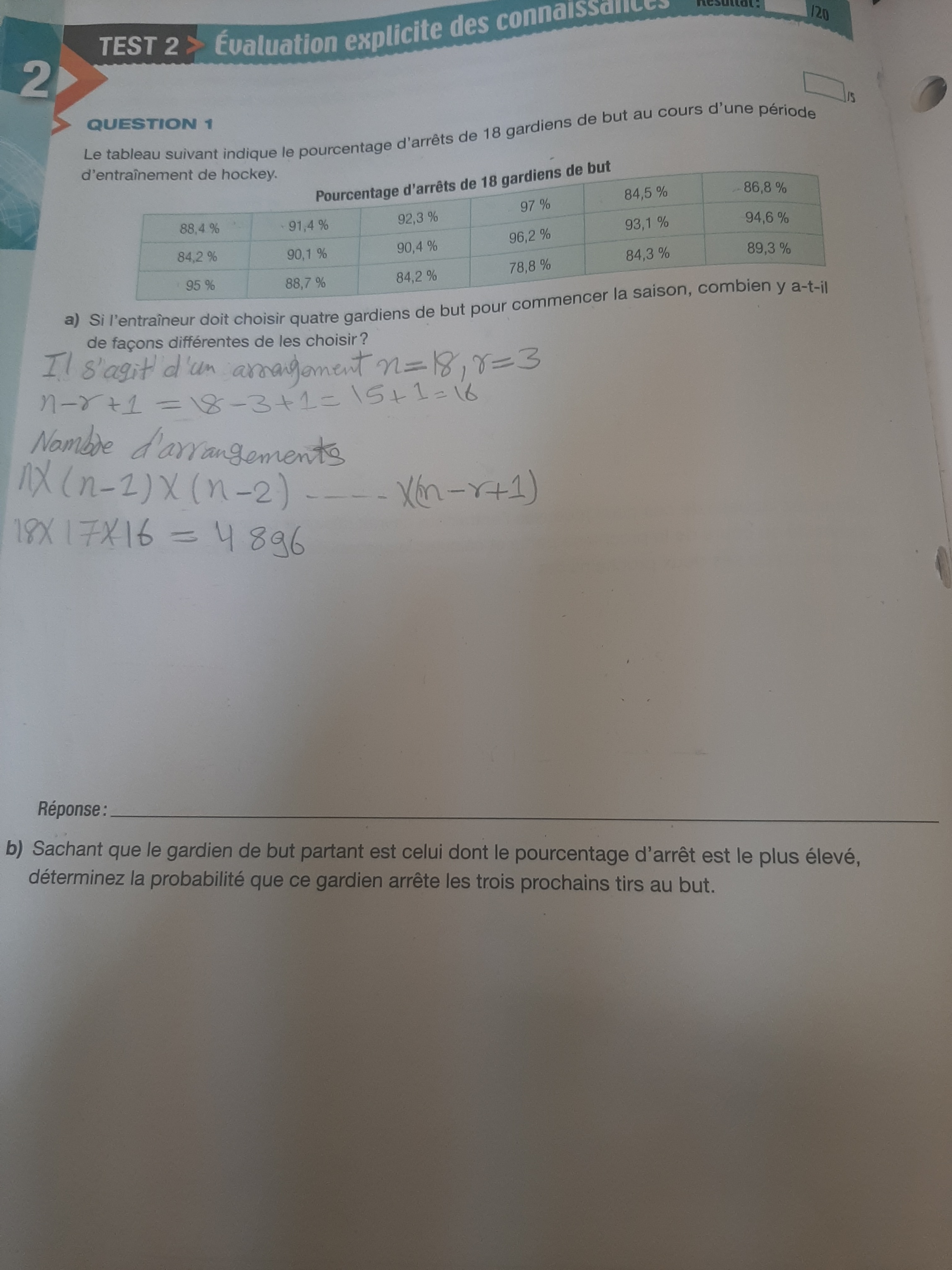 Je répond au premier. Je crois que tu as mal fait tes calculs. En analyse combinatoire, ce que tu fais c'est calculer le nombre de combinaisons possibles de 4 gardiens dans un groupe de 18.
