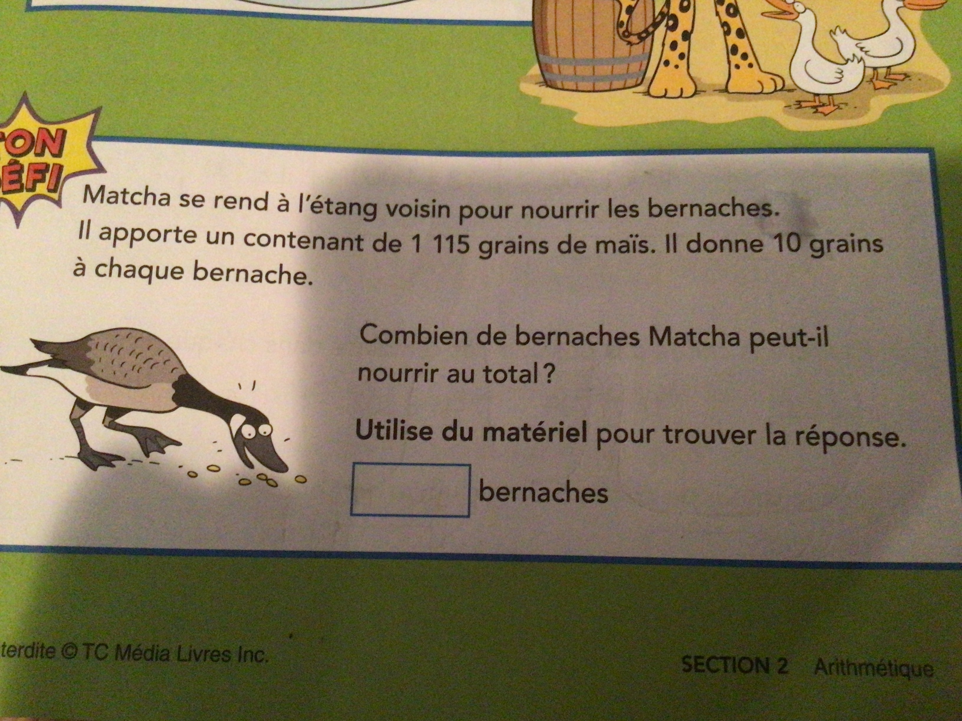 En fait, la question de ce numéro revient à se questionner sur le nombre de bernaches que tu peux nourrir avec les 1 115 grains de maïs si, pour en nourrir une, elle a besoin de 10 grains. Cela revient à diviser par 10 les 1 115 grains de maïs.
