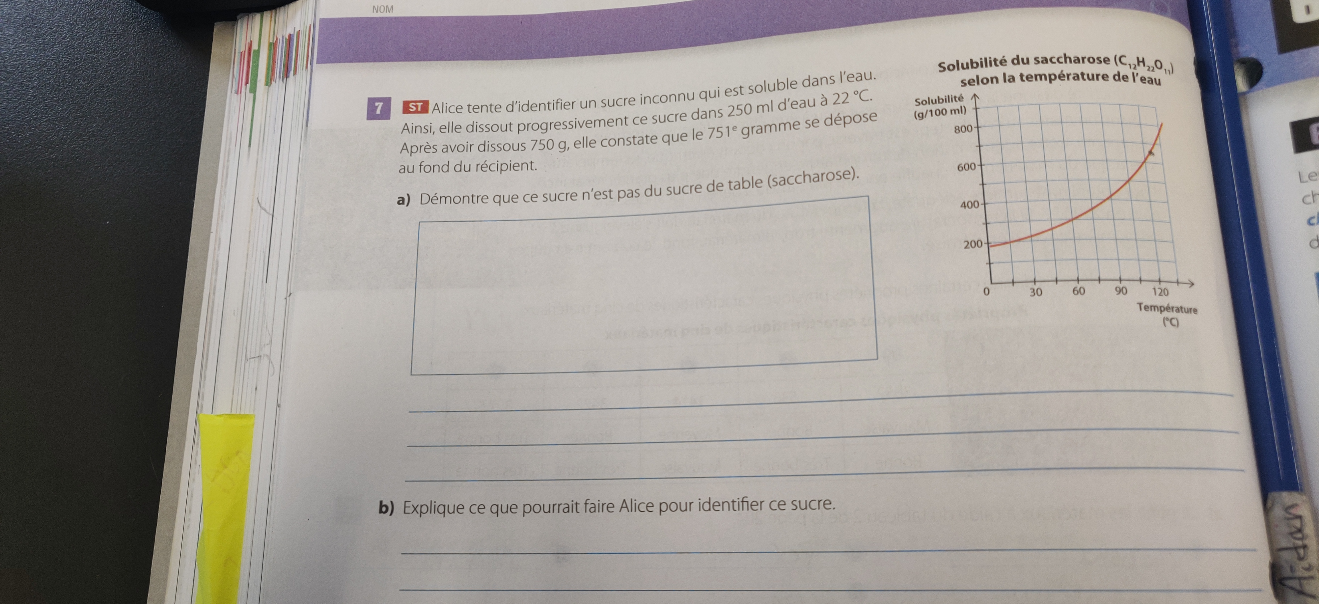 a) Tu dois comparer la solubilité maximale du sucre inconnu à 22 degrés Celsius (soit 750 g) à celle qui s'affiche dans le graphique vis-à-vis de la température de 22 degrés Celsius. Tu verras que ces deux valeurs ne sont pas identiques. Le sucre inconnu a donc une solubilité différente que le saccharose.
