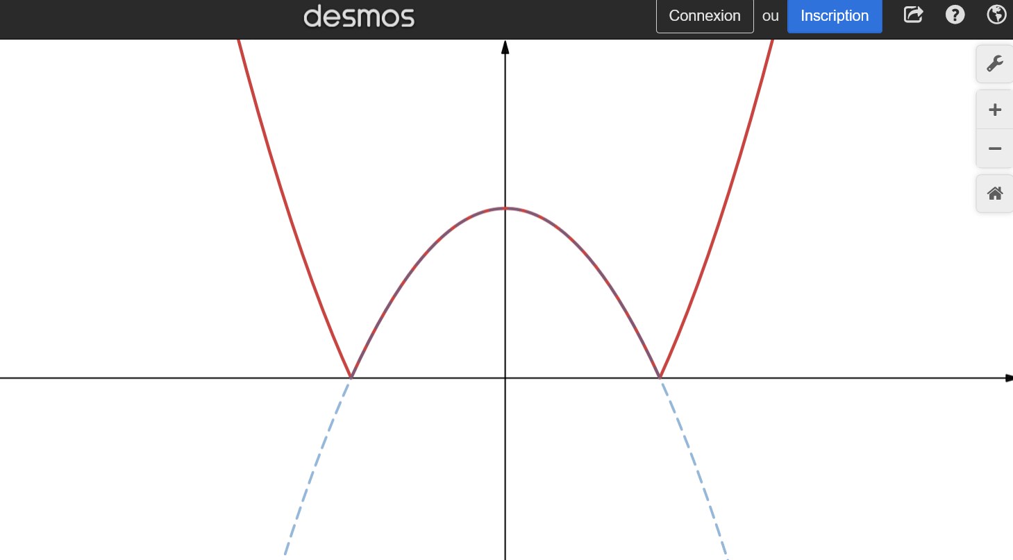 En pointillés bleus, la fonction f(x)=36-x²