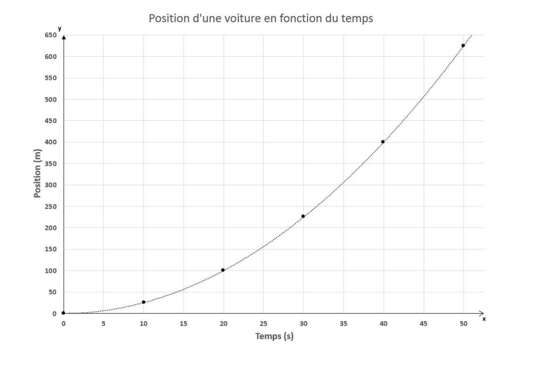 Bonjour, je voudrais savoir à quoi devrait ressembler un graphique de la distance en fonction du temps si l’accélération est constante.
