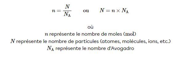 La première équation vise à déterminer un certain nombre de particules correspond à quel nombre de moles. En effet, au même titre qu'une douzaine correspond à 12, une mole correspond à 6,022×10^-23, le nombre d'Avogado. En divisant un nombre de particules par le nombre d'Avogadro, on obtient donc logiquement le nombre de moles correspondant.