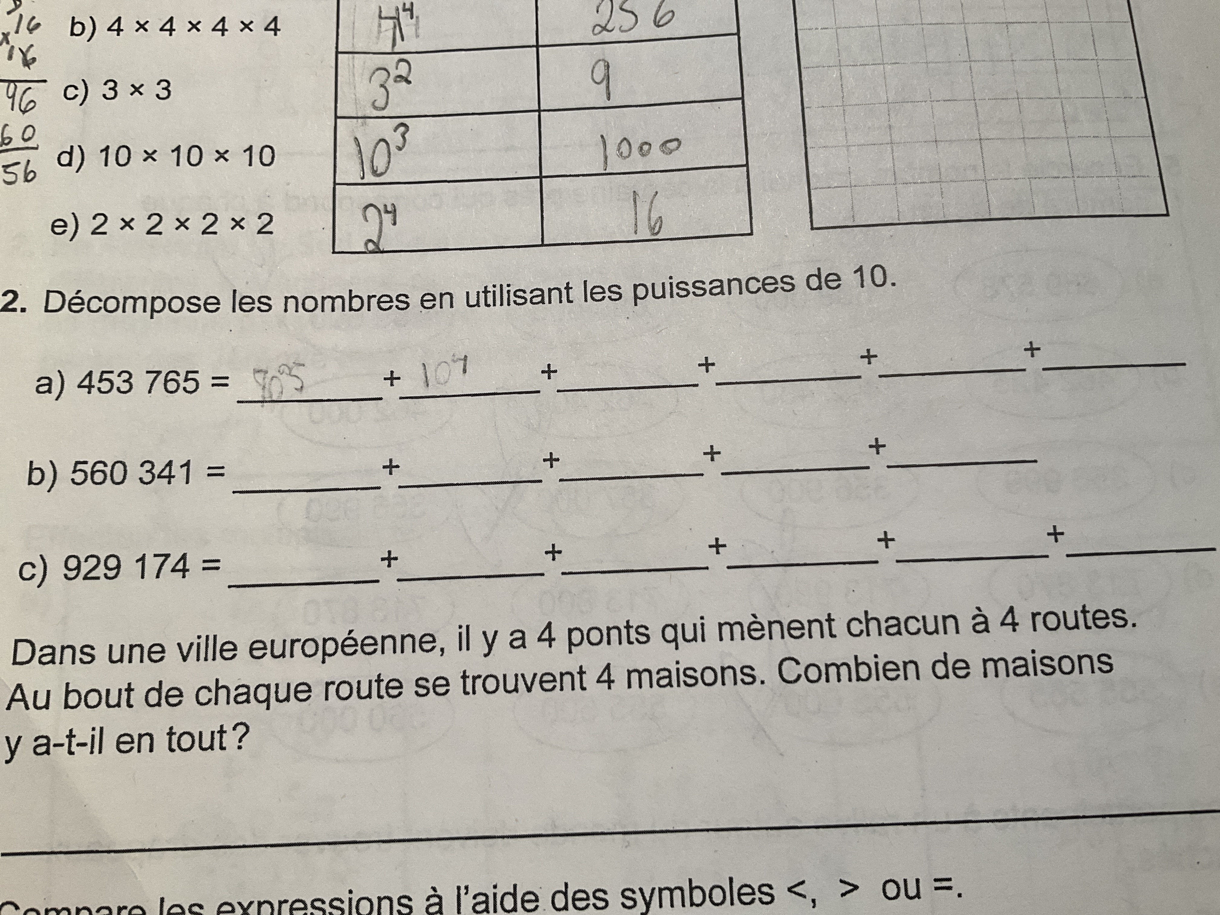 Pour décomposer un nombre avec les puissances de 10, tu dois toujours multiplier un nombre par 10, puis rajouter un exposant au nombre 10 pour que cela donne la bonne valeur.