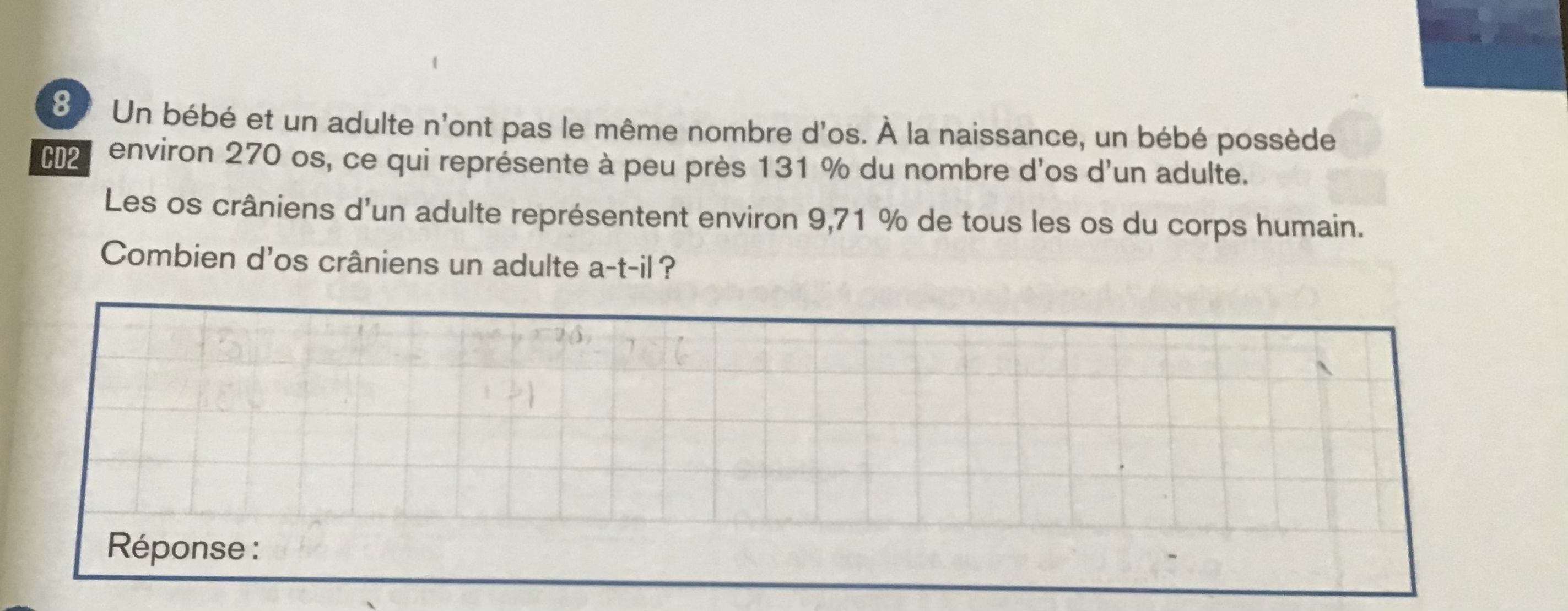 Ainsi, en sachant que 270 os représentent 131% des os d'un adulte, on peut trouver le nombre inconnu à l'aide de proportions: