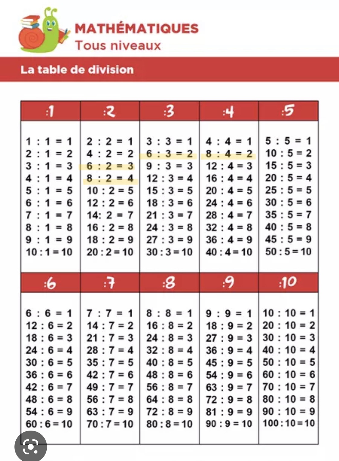 Tu peux ensuite prendre tes tables de divisions, et souligner toutes les divisions ayant des nombres à 1 chiffre, et où aucun nombre n’est répété plus d’une fois, on obtient alors ceci :