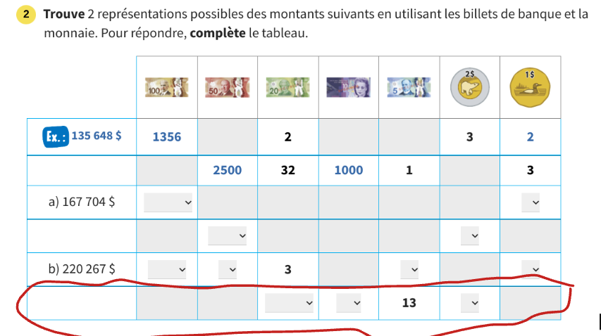 Puis, tu pourrais diviser le montant par 20, afin de connaître le nombre de billets de 20$ que tu dois avoir au maximum. Ensuite, tu devras t'arranger pour décomposer le montant restant avec des billets de 10$ et des pièces de 2$.