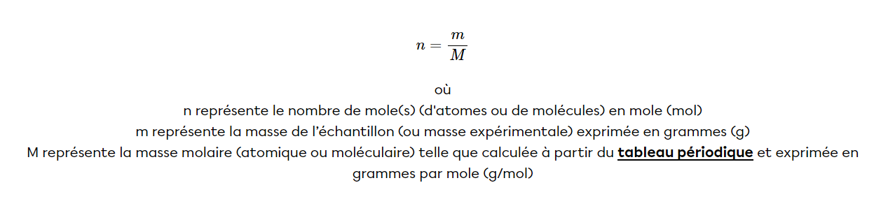 Pour répondre à cette question, tu dois d'abord trouver la masse molaire. Ensuite, tu dois utiliser cette formule :