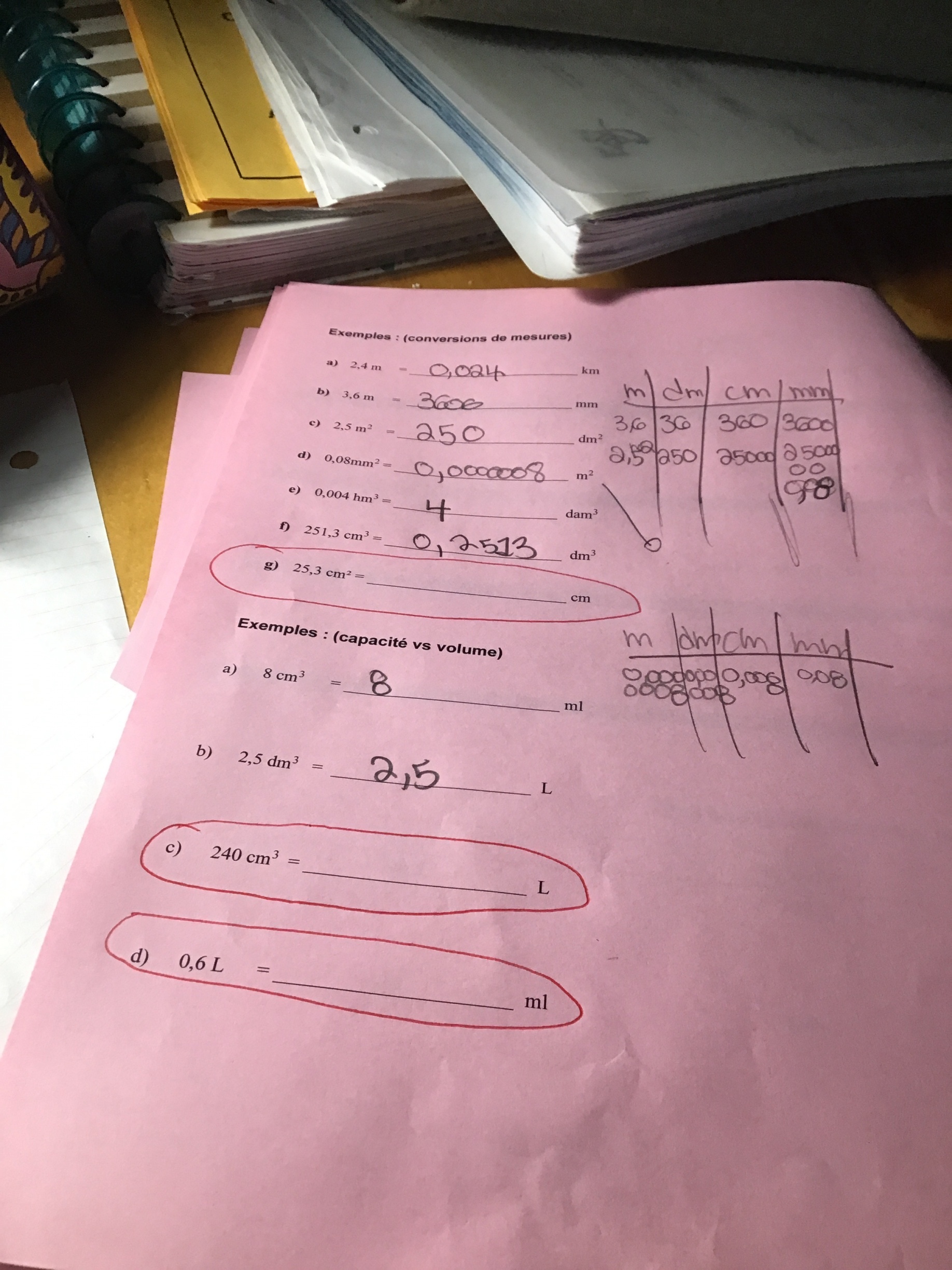 En d), pour convertir les L en ml, tu dois multiplier par 1000.
