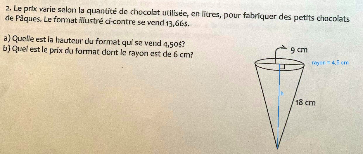 On peut commencer par calculer la hauteur du cône illustré.