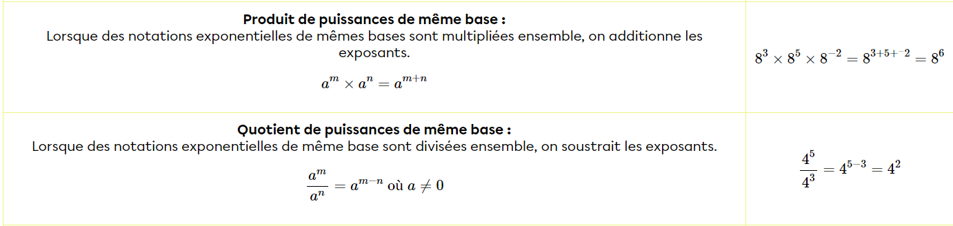 Lorsque deux termes se multiplient, on applique une addition entre les exposants.