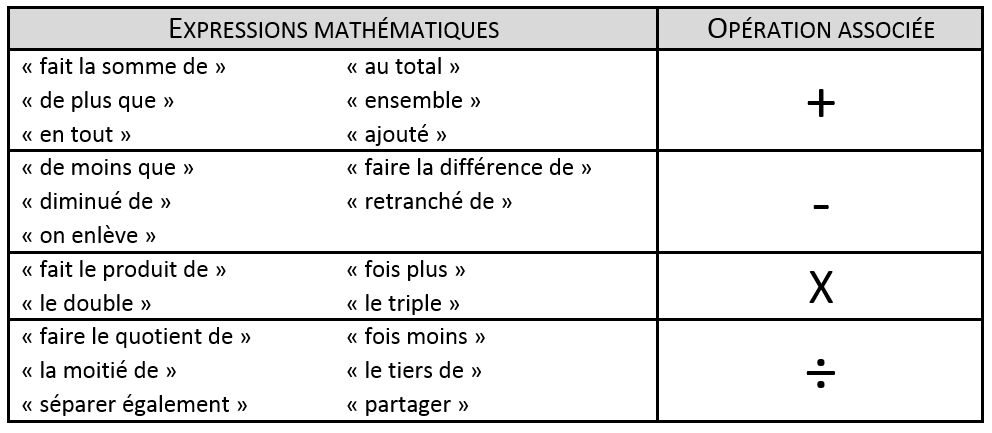 Voici un tableau utile pour savoir les mots clés associés aux opérations.